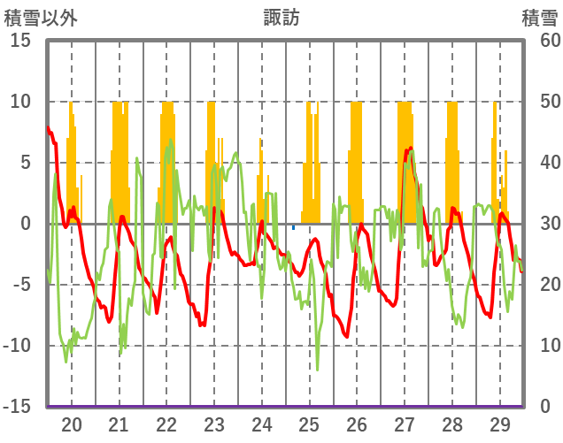 | 日 | 時 | 気温 | 降水 | 風向/風速 | 日照 | 積雪 | 降雪 |