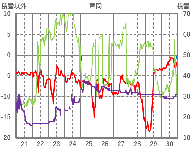 | 日 | 時 | 気温 | 降水 | 風向/風速 | 日照 | 積雪 | 降雪 |
