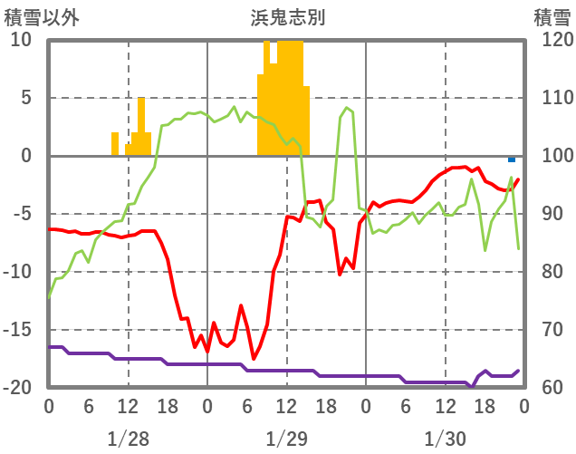 | 日 | 時 | 気温 | 降水 | 風向/風速 | 日照 | 積雪 | 降雪 |