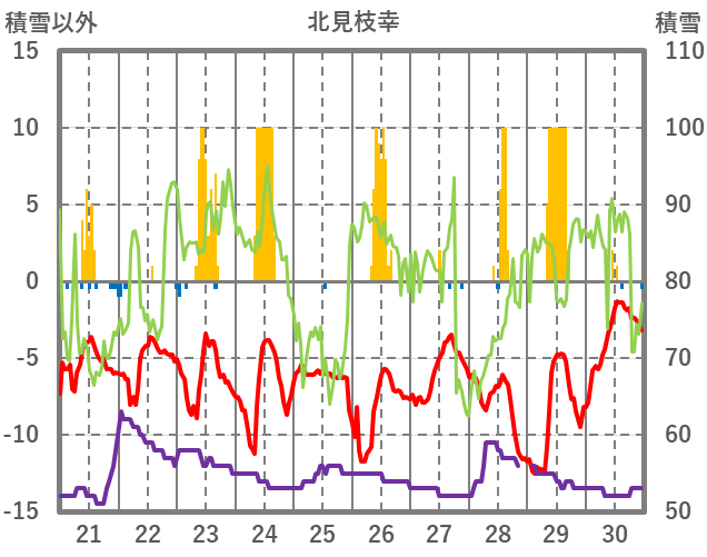 | 日 | 時 | 気温 | 降水 | 風向/風速 | 日照 | 積雪 | 降雪 |