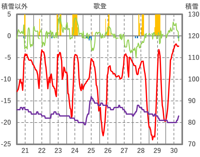 | 日 | 時 | 気温 | 降水 | 風向/風速 | 日照 | 積雪 | 降雪 |