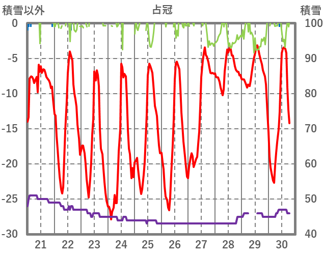 | 日 | 時 | 気温 | 降水 | 風向/風速 | 日照 | 積雪 | 降雪 |