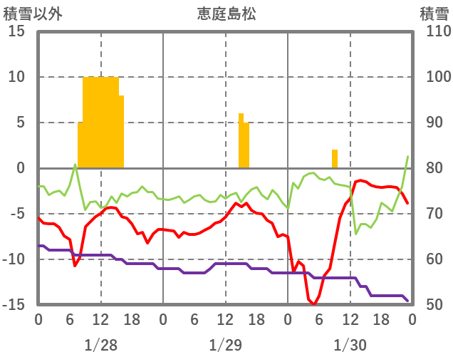 | 日 | 時 | 気温 | 降水 | 風向/風速 | 日照 | 積雪 | 降雪 |