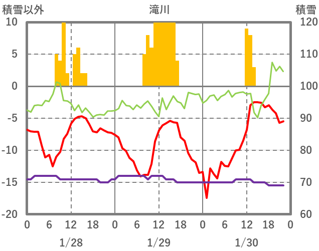 | 日 | 時 | 気温 | 降水 | 風向/風速 | 日照 | 積雪 | 降雪 |