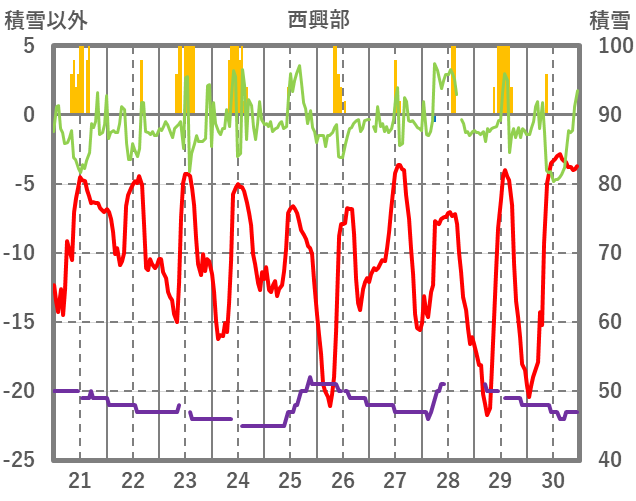 | 日 | 時 | 気温 | 降水 | 風向/風速 | 日照 | 積雪 | 降雪 |