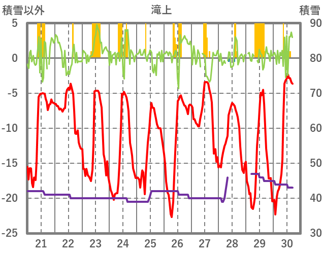 | 日 | 時 | 気温 | 降水 | 風向/風速 | 日照 | 積雪 | 降雪 |