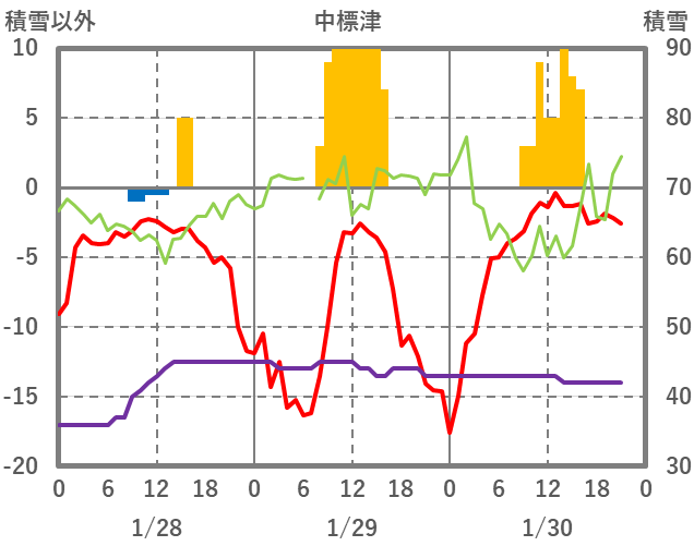 | 日 | 時 | 気温 | 降水 | 風向/風速 | 日照 | 積雪 | 降雪 |