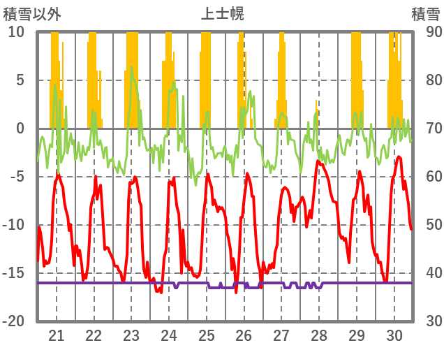 | 日 | 時 | 気温 | 降水 | 風向/風速 | 日照 | 積雪 | 降雪 |
