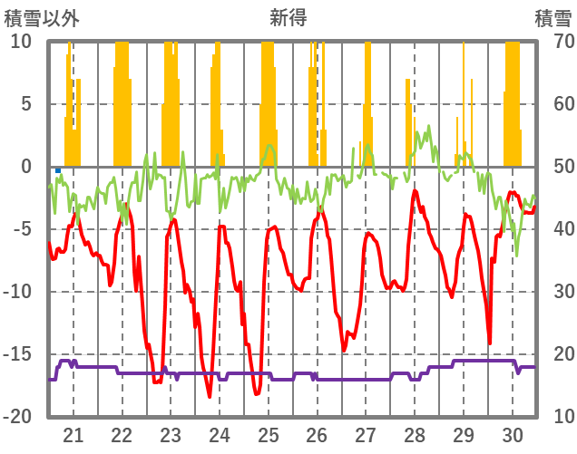 | 日 | 時 | 気温 | 降水 | 風向/風速 | 日照 | 積雪 | 降雪 |