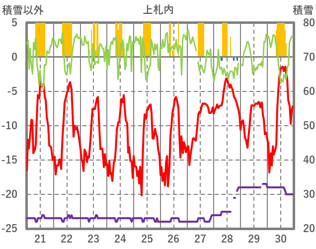 | 日 | 時 | 気温 | 降水 | 風向/風速 | 日照 | 積雪 | 降雪 |