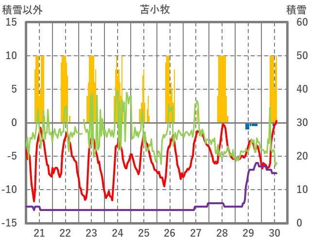 | 日 | 時 | 気温 | 降水 | 風向/風速 | 日照 | 積雪 | 降雪 |