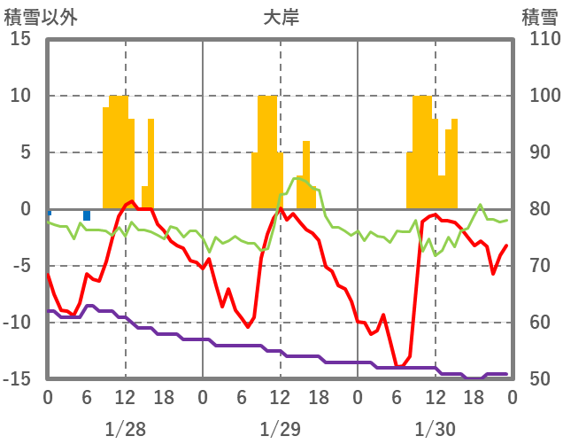 | 日 | 時 | 気温 | 降水 | 風向/風速 | 日照 | 積雪 | 降雪 |