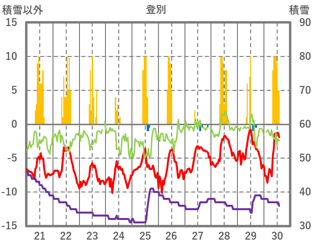 | 日 | 時 | 気温 | 降水 | 風向/風速 | 日照 | 積雪 | 降雪 |