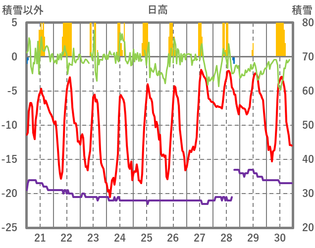 | 日 | 時 | 気温 | 降水 | 風向/風速 | 日照 | 積雪 | 降雪 |