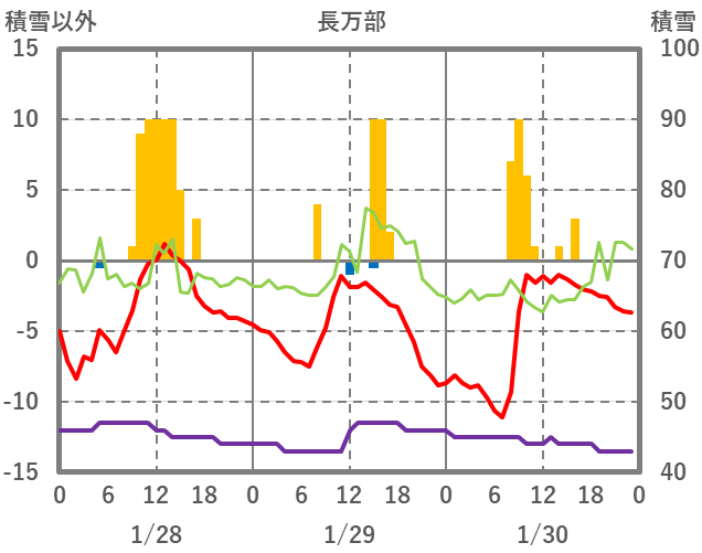 | 日 | 時 | 気温 | 降水 | 風向/風速 | 日照 | 積雪 | 降雪 |