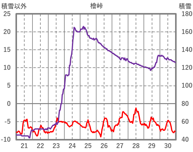 | 日 | 時 | 気温 | 降水 | 風向/風速 | 日照 | 積雪 | 降雪 |