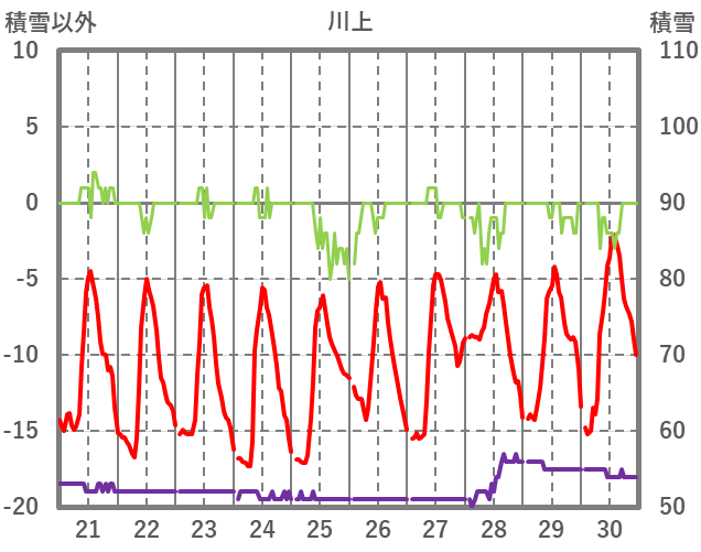 | 日 | 時 | 気温 | 降水 | 風向/風速 | 日照 | 積雪 | 降雪 |