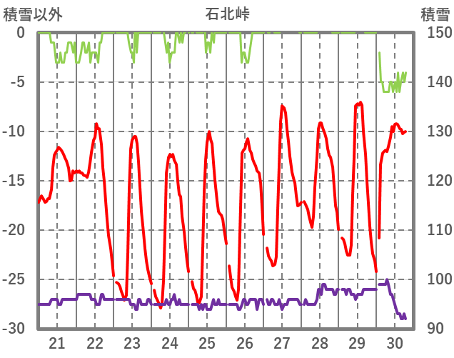 | 日 | 時 | 気温 | 降水 | 風向/風速 | 日照 | 積雪 | 降雪 |