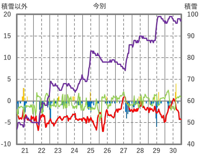 | 日 | 時 | 気温 | 降水 | 風向/風速 | 日照 | 積雪 | 降雪 |