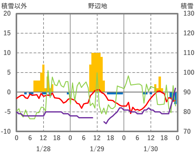 | 日 | 時 | 気温 | 降水 | 風向/風速 | 日照 | 積雪 | 降雪 |