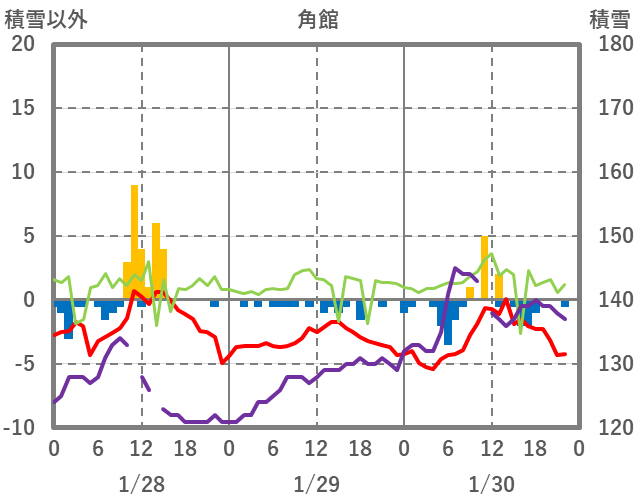 | 日 | 時 | 気温 | 降水 | 風向/風速 | 日照 | 積雪 | 降雪 |
