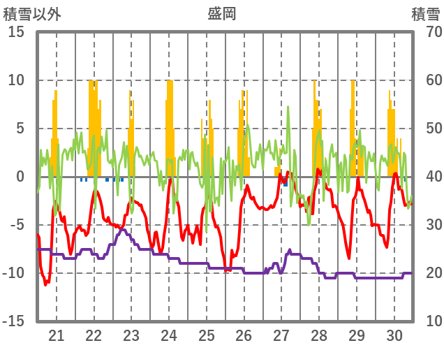 | 日 | 時 | 気温 | 降水 | 風向/風速 | 日照 | 積雪 | 降雪 |