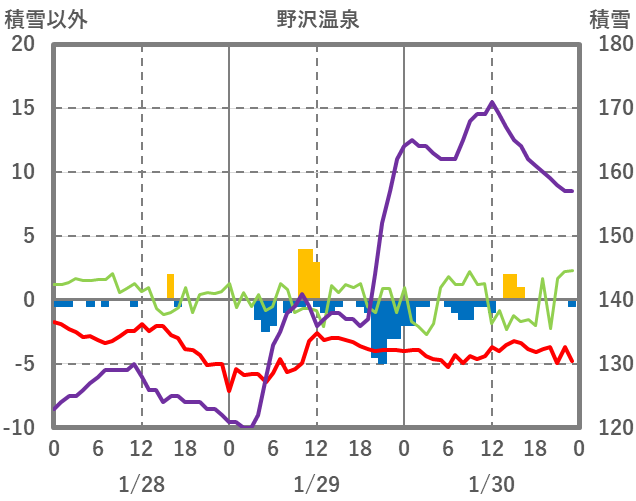 | 日 | 時 | 気温 | 降水 | 風向/風速 | 日照 | 積雪 | 降雪 |
