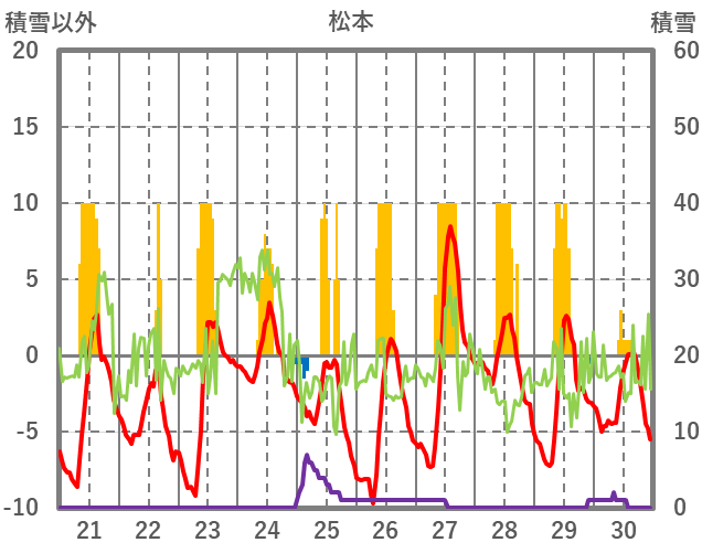 | 日 | 時 | 気温 | 降水 | 風向/風速 | 日照 | 積雪 | 降雪 |