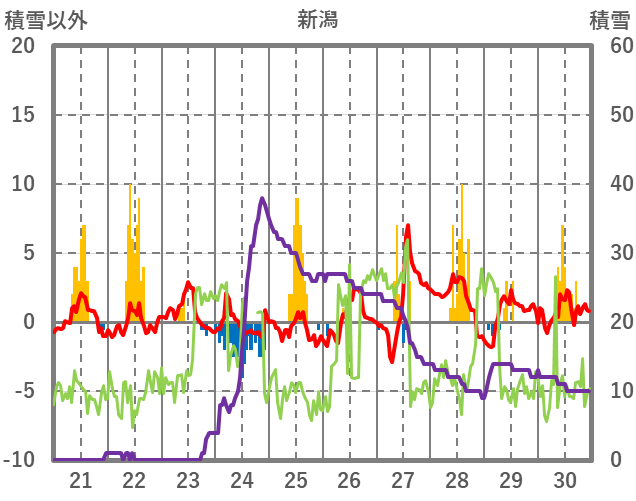 | 日 | 時 | 気温 | 降水 | 風向/風速 | 日照 | 積雪 | 降雪 |