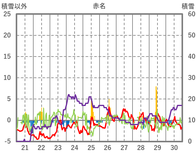| 日 | 時 | 気温 | 降水 | 風向/風速 | 日照 | 積雪 | 降雪 |