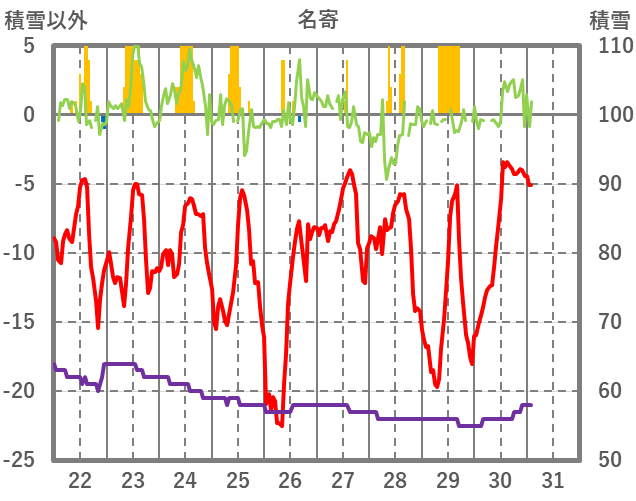 | 日 | 時 | 気温 | 降水 | 風向/風速 | 日照 | 積雪 | 降雪 |