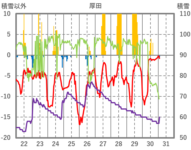 | 日 | 時 | 気温 | 降水 | 風向/風速 | 日照 | 積雪 | 降雪 |