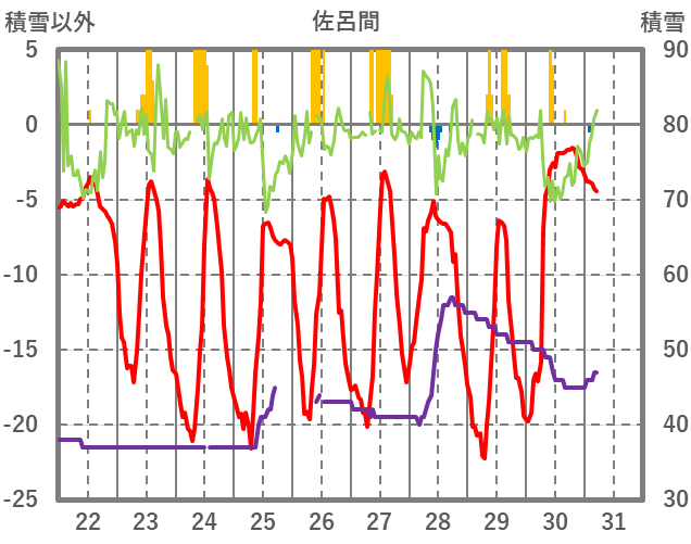 | 日 | 時 | 気温 | 降水 | 風向/風速 | 日照 | 積雪 | 降雪 |