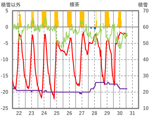 | 日 | 時 | 気温 | 降水 | 風向/風速 | 日照 | 積雪 | 降雪 |