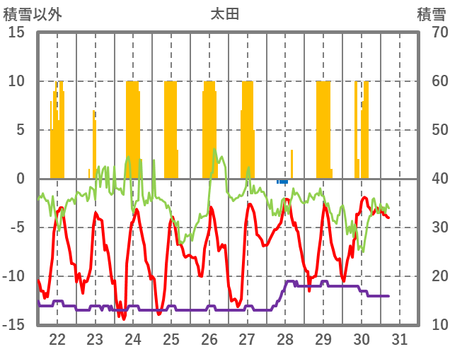 | 日 | 時 | 気温 | 降水 | 風向/風速 | 日照 | 積雪 | 降雪 |