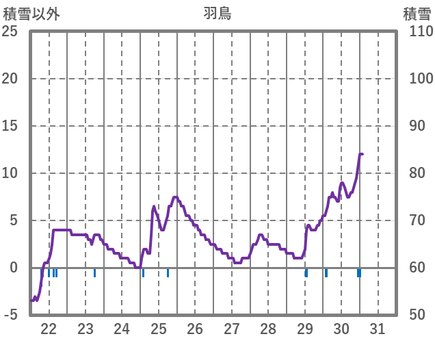 | 日 | 時 | 気温 | 降水 | 風向/風速 | 日照 | 積雪 | 降雪 |