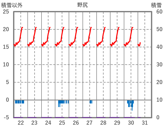 | 日 | 時 | 気温 | 降水 | 風向/風速 | 日照 | 積雪 | 降雪 |