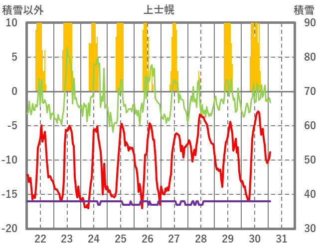 | 日 | 時 | 気温 | 降水 | 風向/風速 | 日照 | 積雪 | 降雪 |