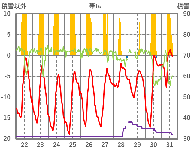 | 日 | 時 | 気温 | 降水 | 風向/風速 | 日照 | 積雪 | 降雪 |