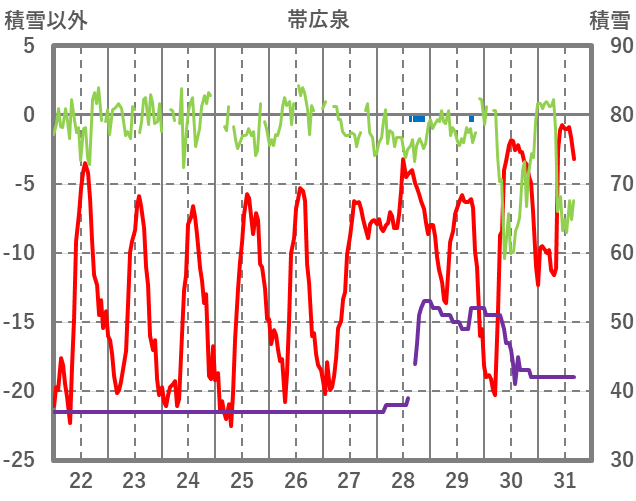 | 日 | 時 | 気温 | 降水 | 風向/風速 | 日照 | 積雪 | 降雪 |