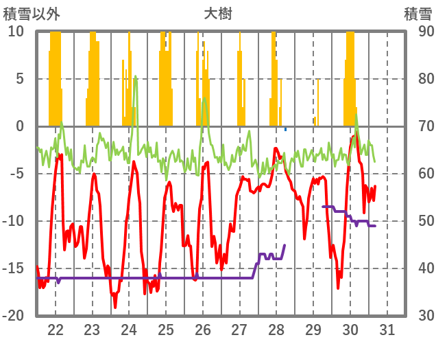 | 日 | 時 | 気温 | 降水 | 風向/風速 | 日照 | 積雪 | 降雪 |