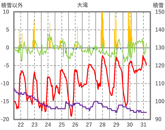 | 日 | 時 | 気温 | 降水 | 風向/風速 | 日照 | 積雪 | 降雪 |
