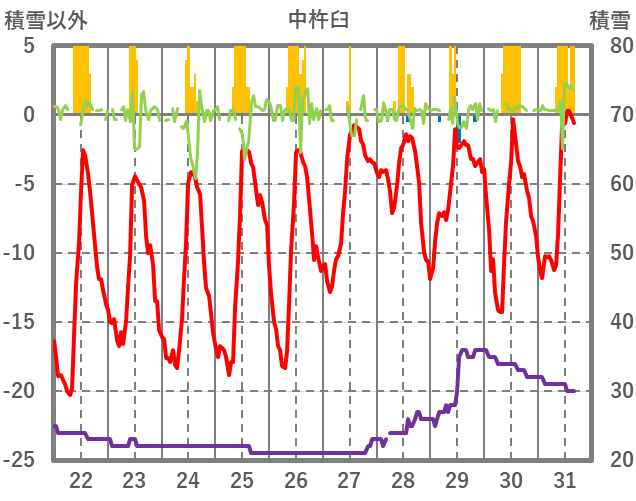 | 日 | 時 | 気温 | 降水 | 風向/風速 | 日照 | 積雪 | 降雪 |