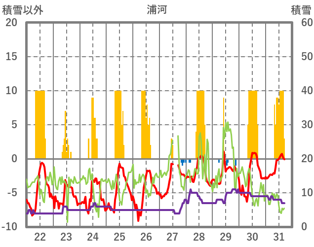 | 日 | 時 | 気温 | 降水 | 風向/風速 | 日照 | 積雪 | 降雪 |