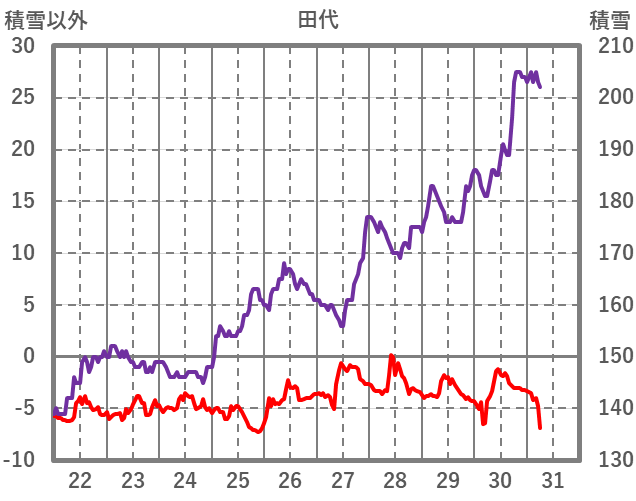 | 日 | 時 | 気温 | 降水 | 風向/風速 | 日照 | 積雪 | 降雪 |