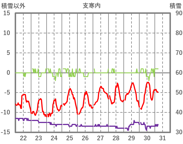 | 日 | 時 | 気温 | 降水 | 風向/風速 | 日照 | 積雪 | 降雪 |