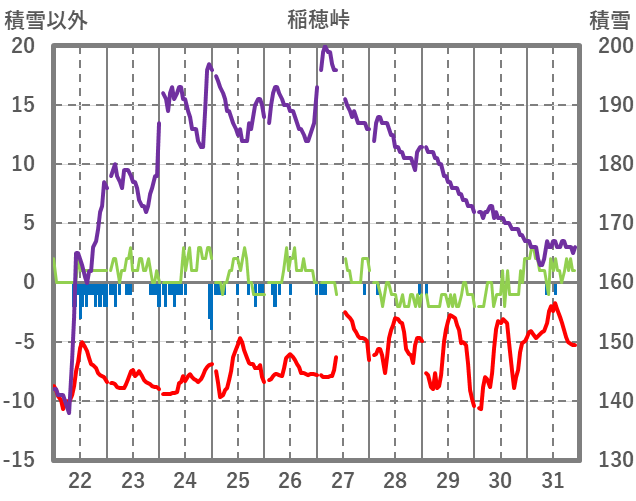 | 日 | 時 | 気温 | 降水 | 風向/風速 | 日照 | 積雪 | 降雪 |