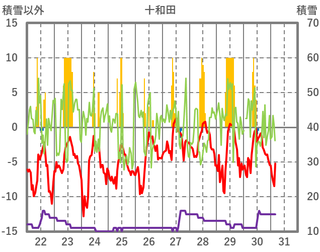 | 日 | 時 | 気温 | 降水 | 風向/風速 | 日照 | 積雪 | 降雪 |