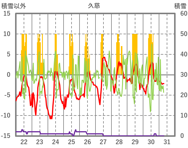 | 日 | 時 | 気温 | 降水 | 風向/風速 | 日照 | 積雪 | 降雪 |