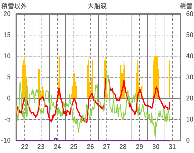 | 日 | 時 | 気温 | 降水 | 風向/風速 | 日照 | 積雪 | 降雪 |